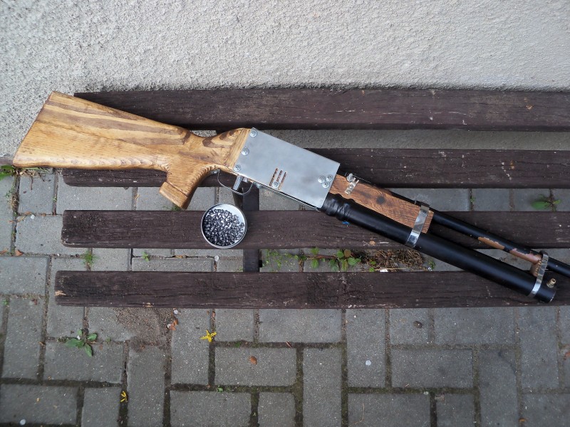 This is my 5.5 mm pellet air gun i made last summer. The paint wear off a bit, need a new paint job :cry: . It runs on 100-120 psi, QDV valve, PVC air chamber. Has a lot off power, pellets easily penetrates through cans and other stuff. This is my second build. I'm really happy about it :D Making a wooden foregrip (Brian the brain thanks for advise).