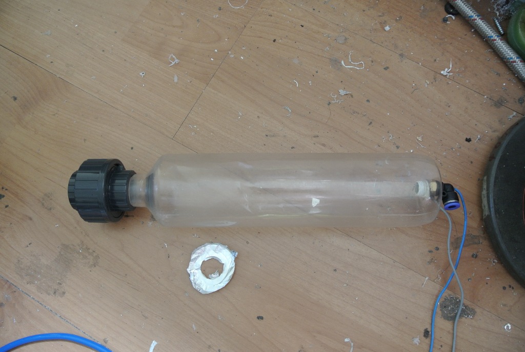 The bottle is around 1L so it shouldn't be too loud and I'm hoping to make it a easy to use and reliable little cannon to entertain my friends. To do that I thought I'll need a pump for venting and easy fuel injecting, that's why I made a 1/4 thread at the bottom and installed a push to connect fitting, it will be connected to a 5/2 valve witch is connected to fuel meter and a pump.