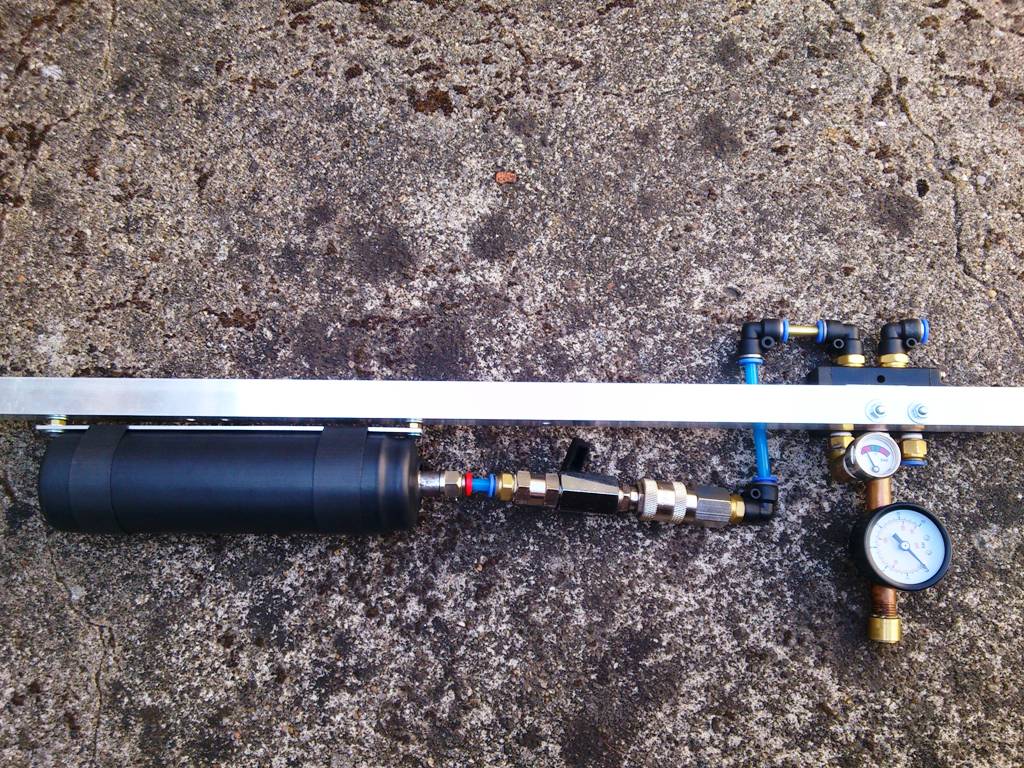 The bottle under the barrel is propane tank, the other grey "tube" is a cheap pump for filling balloons, high volume. Not pressure rated, but it's also isolated from the chamber when firing.