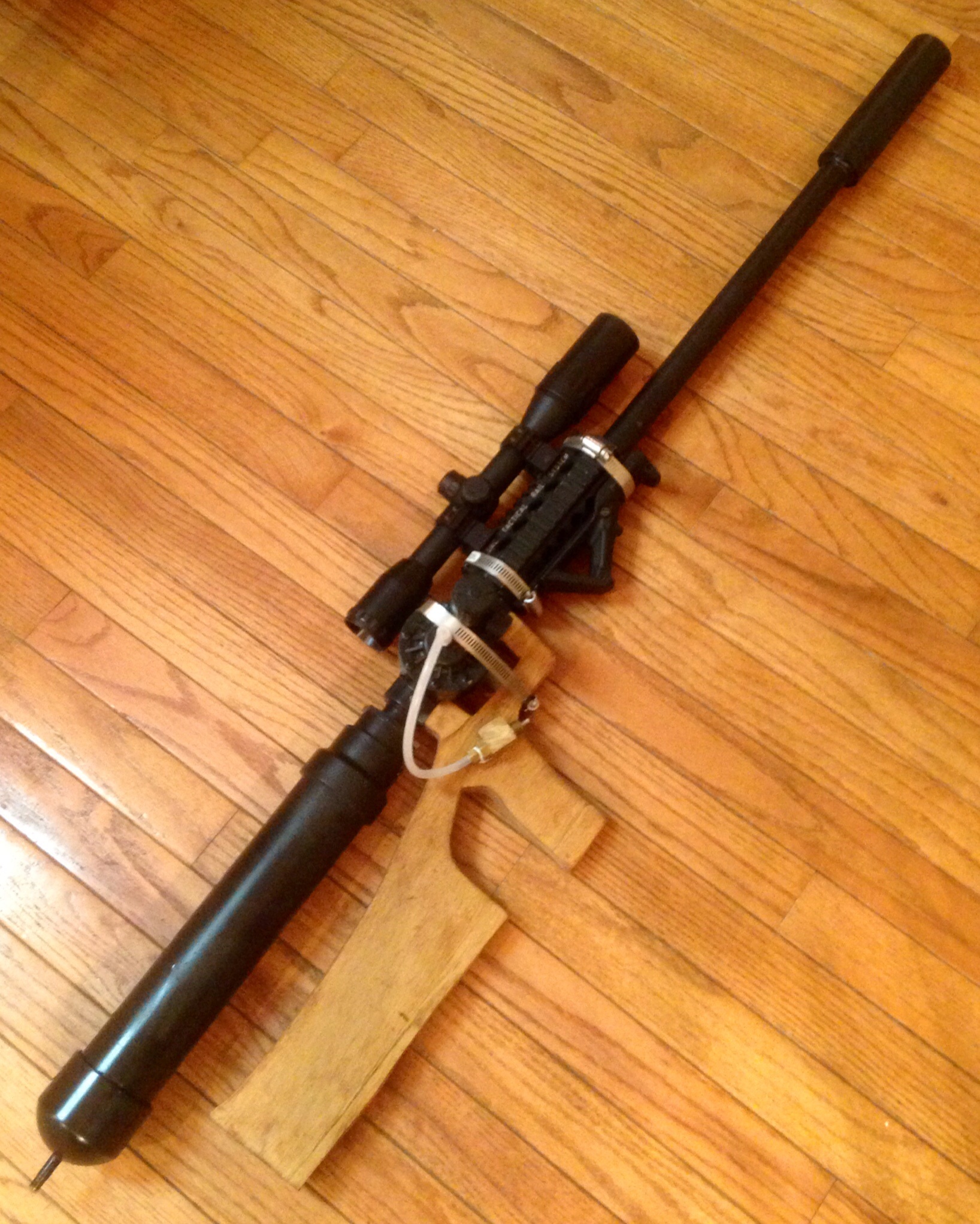 Hi, I'm new to spud files, and have been lurking for a while. This is my first attempt at making a pneumatic launcher and I have just recently finished it. It operates off of a 14 by 2 inch PVC air tank filled via schrader valve. The air is release through a modified sprinkler valve. The barrel consists of a 2 foot long 3/4 inch piece of PVC pipe. External finishes include a wood stock, scavenged airsoft ar15 rail system, a leapers 3x9x40 scope, and a magpul AFG. The current ammunition I'm using are spent 12 gram co2 cartridges wrapped in a ring of duct tape. It is zeroed in at 120' but past that the co2 cartridges start to tumble so I'm looking into making custom rounds. Any comments/suggestions are welcome.