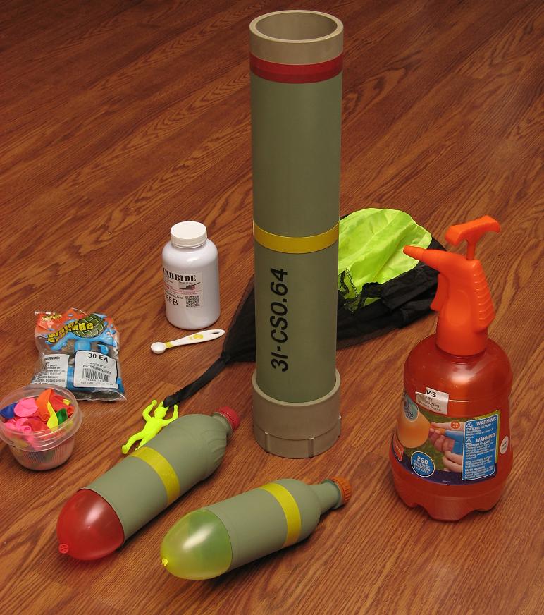 I found this little water balloon tank at CVS, it does 3 functions: fill balloons with air, water or shoot a mist. So it will hold some pressure. I cut the pickup tube inside that pulls up the water so insted it pulls in the acytlene wich mixes with the water. The volume of the tank is about what my 3" cannon uses so i use the same amount of carbide in the tank. Each balloon uses 5 pumps to fill the balloons making the perfect little charge to shoot the empty pop bottles and the little parachute figure. The air to gas is very consistant and WAY more effecient then the cannons wich use 1/4th tsp per shot. This setup will shoot the rockets about 10 times per 1/4 tsp of carbide.