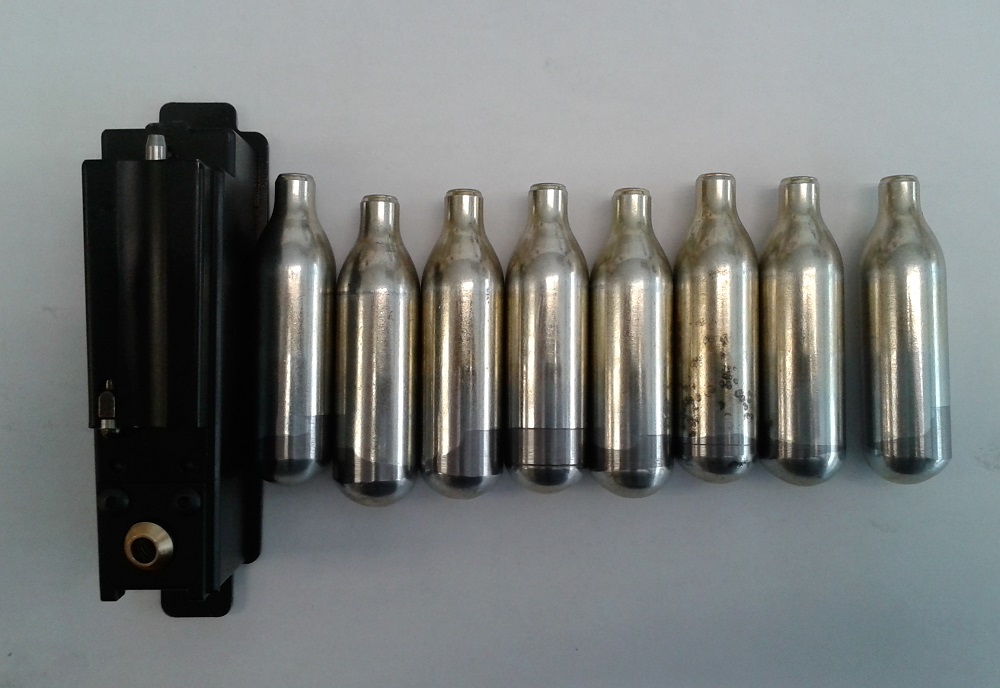 Something silly I did this morning, lathing down some pressurized 8 gram CO2 cartridges so they will fit in a G&G G980 magazine...