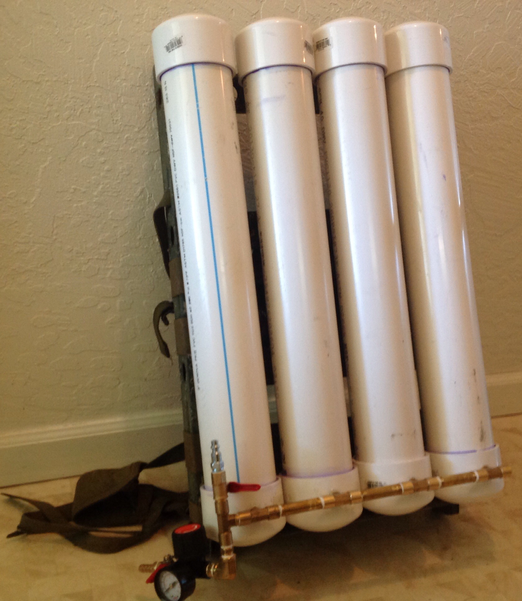 I've been to busy with responsibilities to get much done lately, but my backpack air supply is finally taking shape. It's nothing to fancy. I started with an old Vietnam era frame pack and some 3" sch 40. I have four of the final seven 3"x24" air tanks ready to prep for paint. That's about 3 gal. right now, but should be about 5.2 gal. when completed. A blast shield to give your head and back a layer of protection is in the works. Air is filled through a standard male quick connect with a ball valve and will have both regulated and unregulated attachment points.