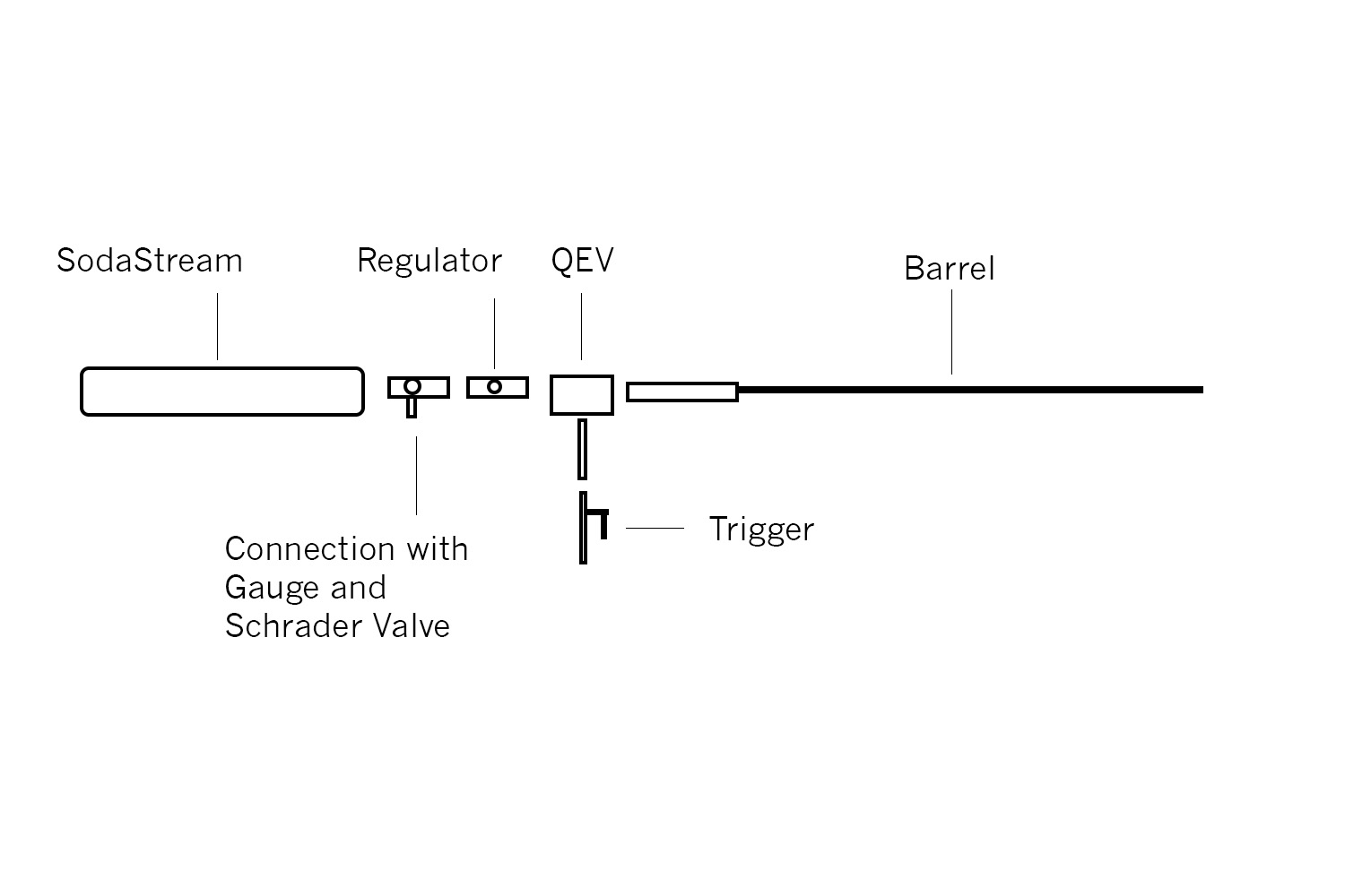 IF you switch place with the soda and the trigger you will have a single shoot gun! You need to put a spring behind the gev piston to be able to fill the gun. If you need multishoot you will ned a hammer valve to pilot or a solenoid!