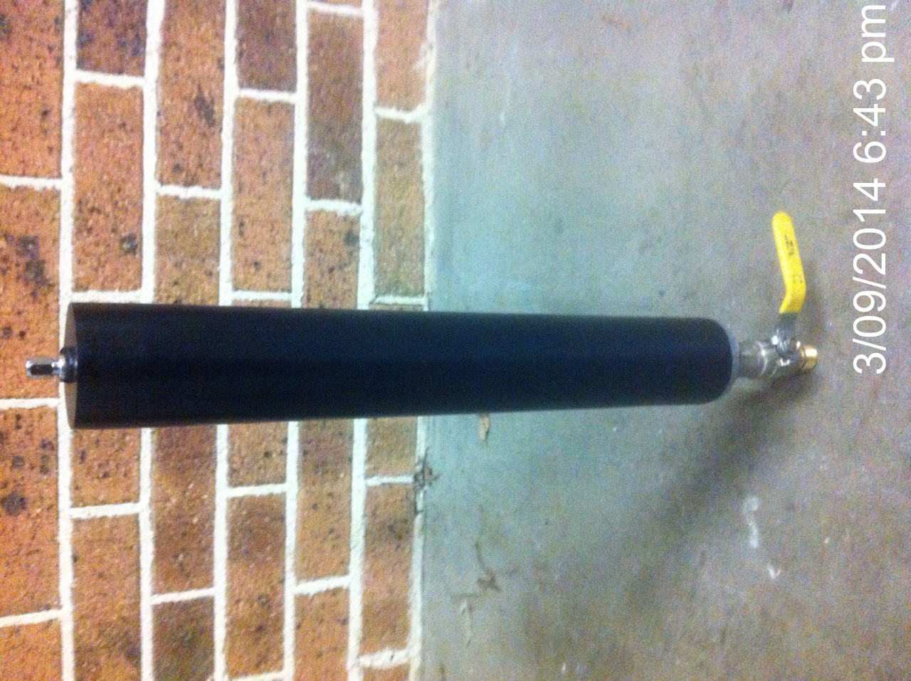 The tank is made of a 40cm/4cm length of approx 1.5mm auto exhaust tube with 2mm end caps MIG welded at each end aswell as the bronze fitting bronzed on and an anchor nut MIG'd on the inside of the other end cap for the schrader valve to be screwed into.