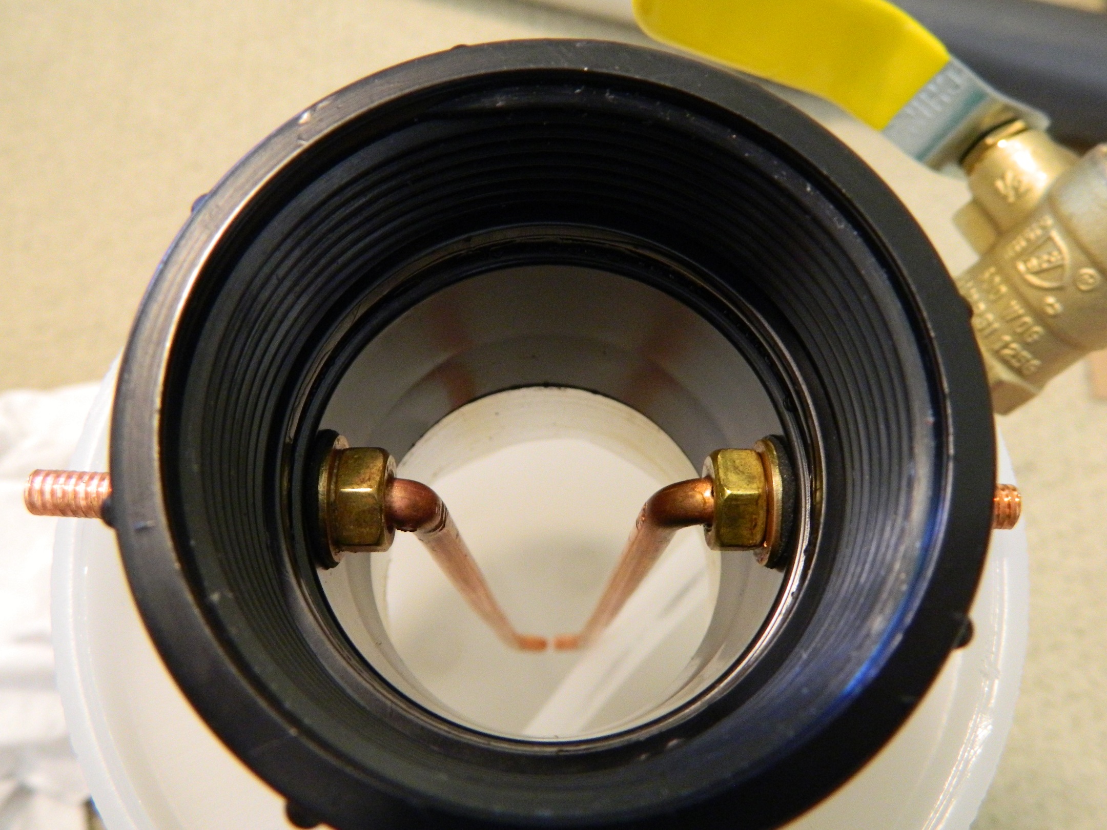 The ignition system consists of two copper wire electrodes that meet in the center of the tank and are connected to a BBQ igniter. The electrodes are fastened through the 2" ABS adapter so that no holes in the weed sprayer tank are made. This is meant to maximize the strength of the tank. The electrodes are sealed with rubber washers on the inside.