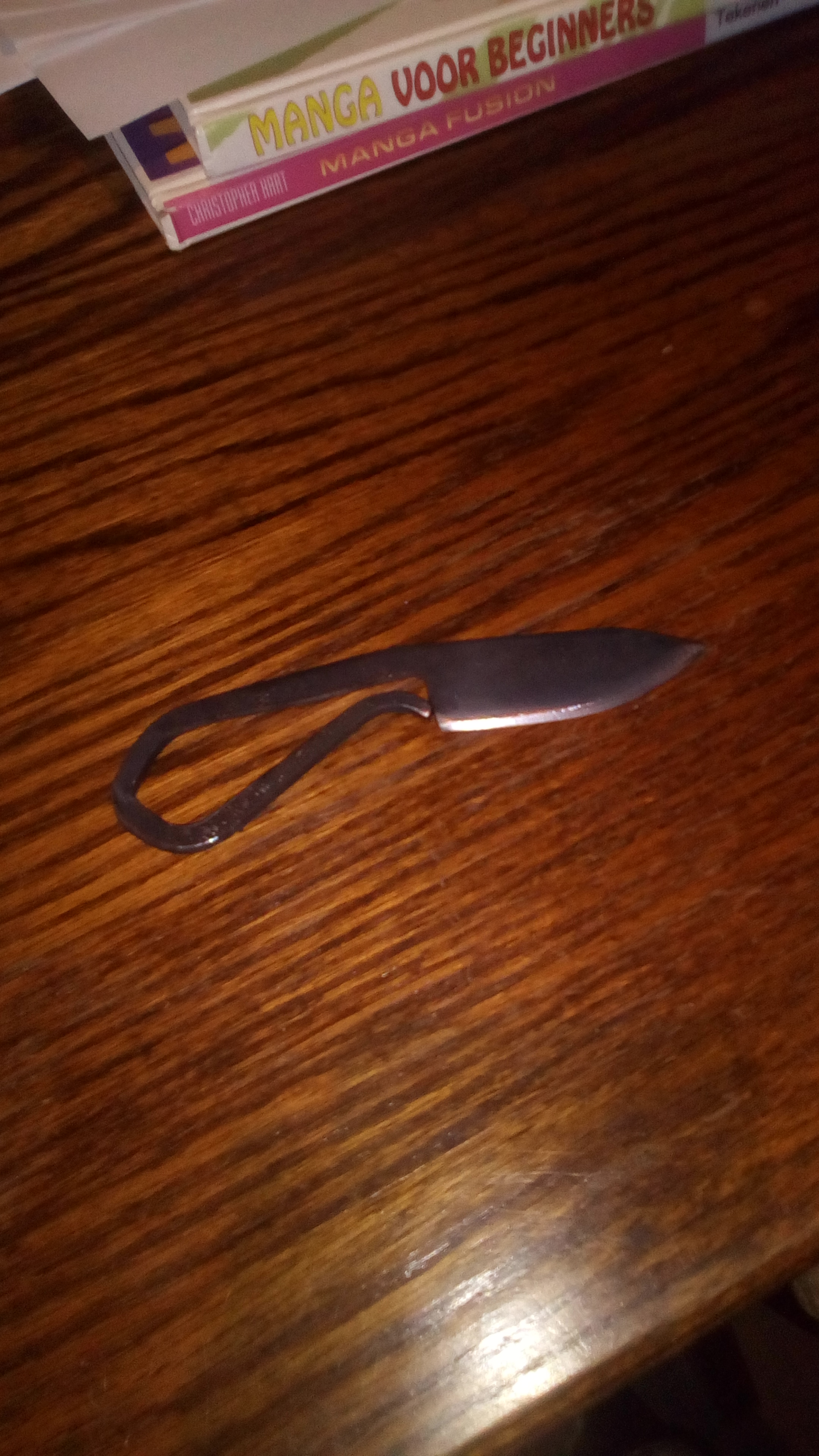 Nice knife, I like the axe handle shape for the handle. I of course love drop point knives, I'll have to try to make one like it, but I personally would make mine a full tang that the metal is exposed on the outside, just my preferences. So far I've flattened a bolt to make a knife, gonna finish when I build a small forge. I'll be back when I finish some knives, I got a pretty cool set, though I need to make the grinds. Any advice to make a 30 degree flat grind?