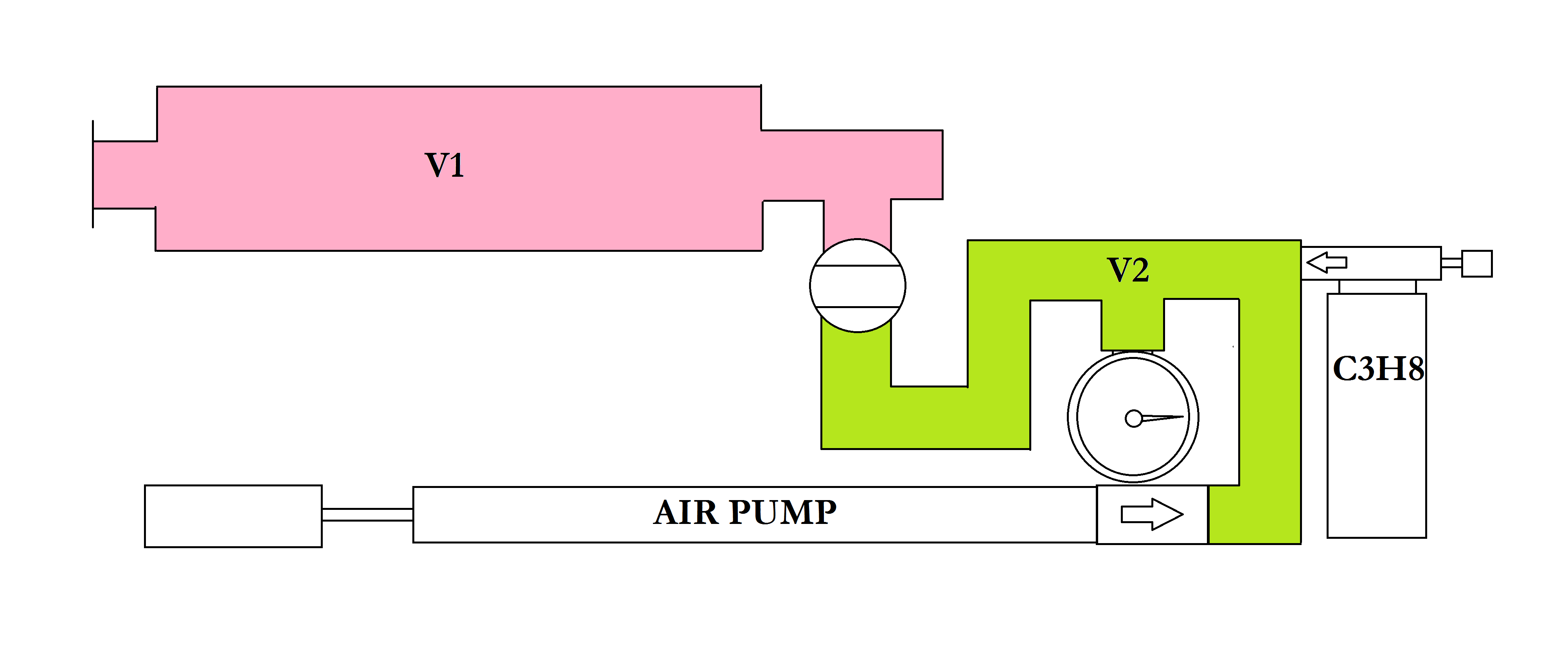 This ^^^ approach worked great for my smaller combustion cannons with small fuel meters. Also, if the ball valves used have a large internal volume inside the ball that is significant you can use my diagram to tell which valves should be considered as which volumes as denoted by the colors red, green, or blue.