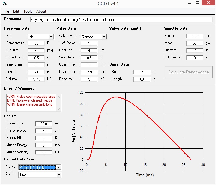 this programs just full of handy surprises. You were just about on par the program spit out a range of 186ft. haha I am compressing the air with a 120v car inflator. I have a compressor on my vacuum former that i could temporally cannibalize but with this being made out of schd 40 PVC i think 110 is a good max psi. I pressure tested everything in the industrial lab at the college to 150psi. But were this will be used by people other then me I cant take as much risk with there safety as i can with mine. The field owner may just kill me if his insurance goes up haha