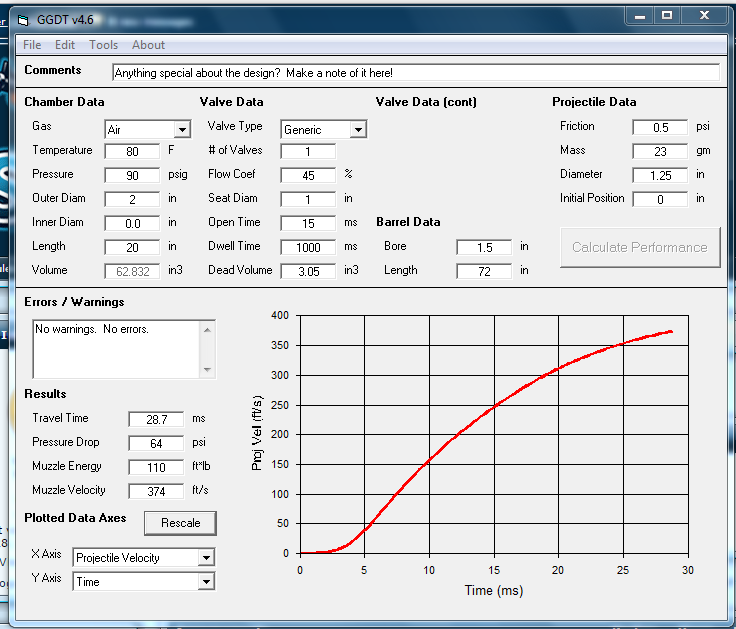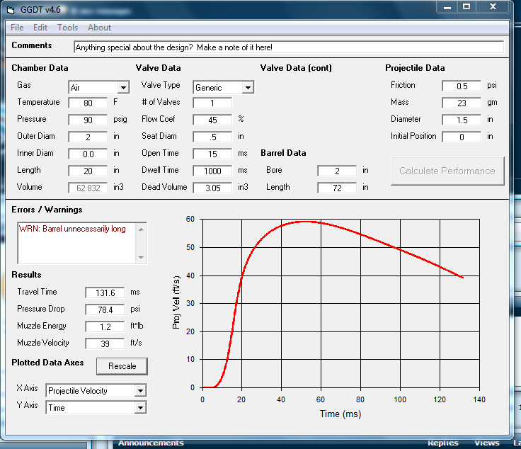 I've been playing with that software a bit today and according to it the biggest changes I can make seems to by making the valve and the plumbing lines bigger and putting in the inner barrel as you said. its also giving me a minor boast to double the tank size. But that may be me doing something wrong in the software. What i'm thinking I will do is replace all the plumbing coming out of the tank with 1 in. I will keep the 2 in barrel for ascetics but will have a 1.5in inner barrel and use 1-1/4 EMT for the shells maybe with some tape to make them tighter. And possibly double the tank size (I found out that doubling it would mean mounting the infiltrator to the barrel itself so i dont know if its worth it for the minor gain the software indicates?) What are yall's thoughts? Can anyone speculate on the kind of range with 370FPS? I was getting up to 20ish with 39fps Is range and FPS linear?