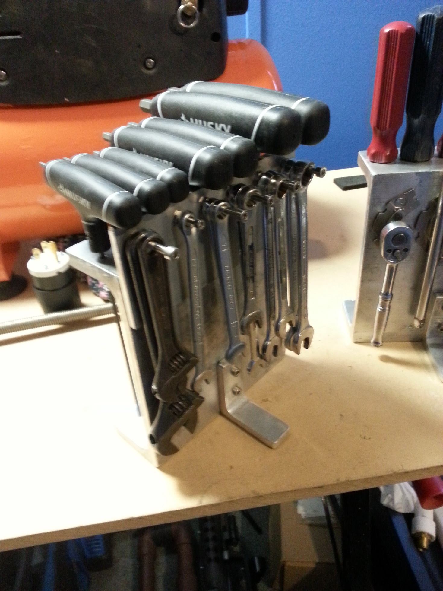 Trying to organise my commonly used tools a bit, found some old aluminium channel to use as a stand. This is my metric nut spinners, 5.5, 7, 8 & 10, metric x7 Hex key driver, 1/4" ratchet (25 year old Snap On and still all original) with Standard and metric sockets.