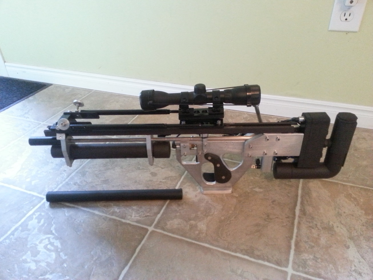 Changed the scope from the fixed 4X to my new adjustable, made cover for the trigger mechanism, black sleeve over barrel (heatshrink) and made a new fake silencer (I lost the old one) :shock: