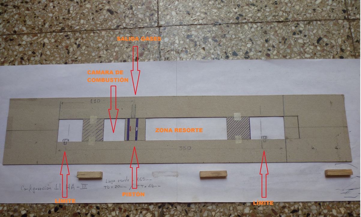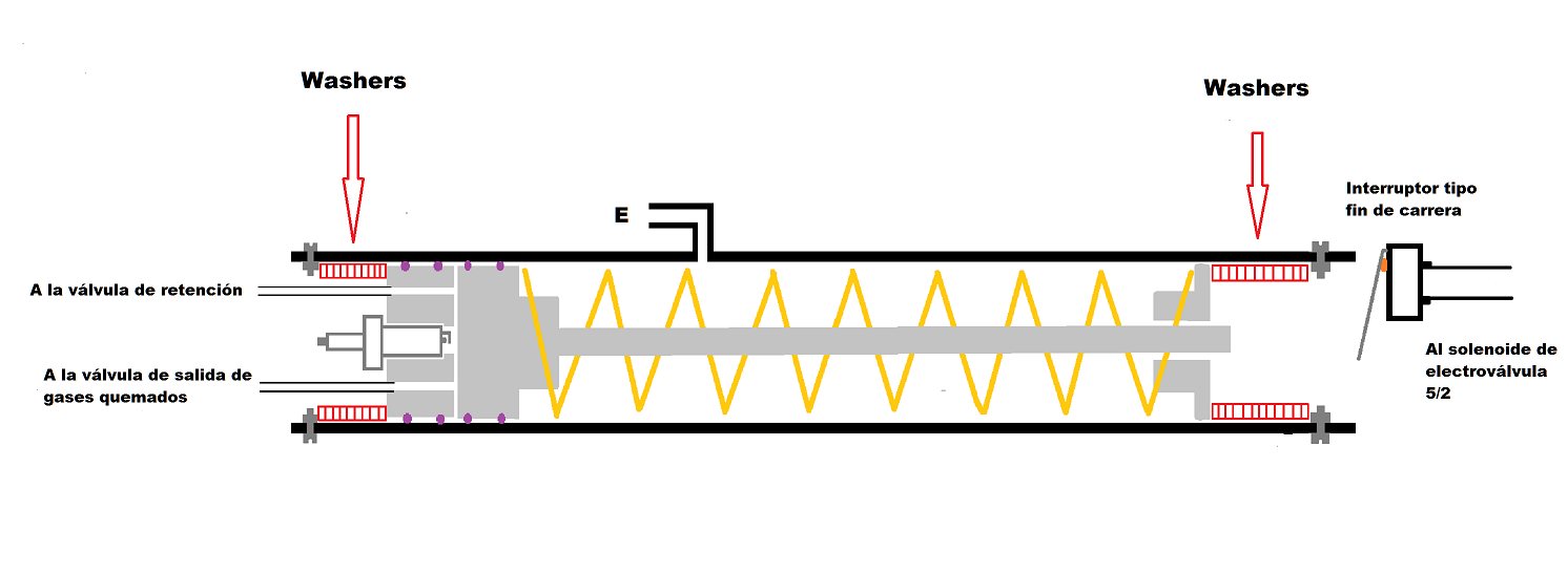I have tried to regulate the opening time of the exhaust port so that it opens before or after. This is achieved by increasing or decreasing the washers, (in red in the diagram), which ultimately moves the piston closer to the outlet orifice. There are important variations in the energy of the shot. The best performances are achieved when it is two or three millimeters, that is, when it does not take long to open. The mass of the piston and spring have to do with this question.