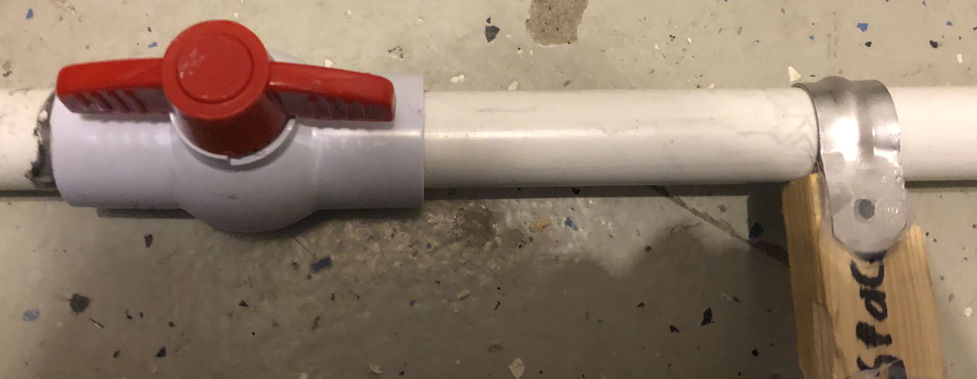 I was at the hardware store a few days ago and I thought “Why not make my 9th spud gun?”. Do I did. It managed to stick a blowgun dart in my garage door from around 10 feet at 100 psi and it shot through 3 or 4 layers of cardboard prior to doing that. The thing that makes it special (for me, at least) is, the barrel slides forward and I can load stuff in like that instead. I haven’t done a range test but I bet it would go 50 to 100 metres. The spacer is a piece of wood (the writing says spacer so I wouldn’t accidentally throw it out) and a bent 35 cent bracket.
