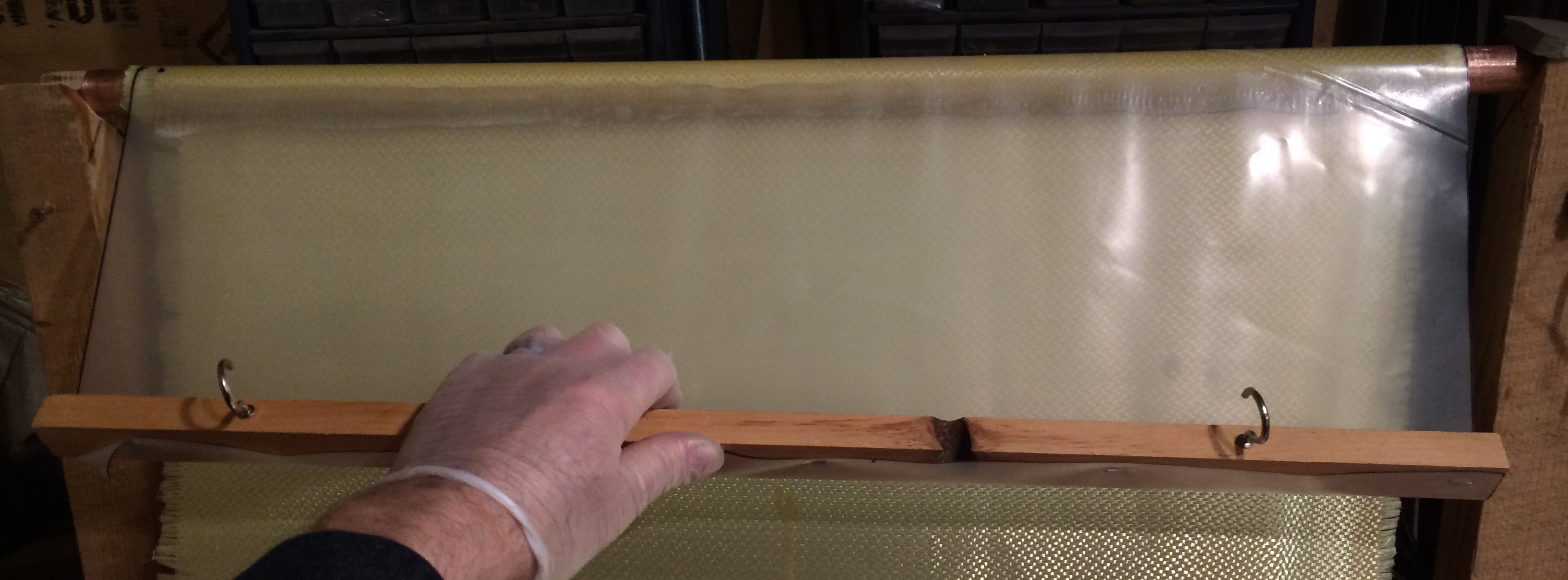 The trick was building a jig to maintain some tension on the fabric as it is being wetted with epoxy, and then to hold the seam flat while the epoxy cures. I gave up using vacuum as it was just too tricky to keep the wrinkles and blisters out on this type of lay-up.