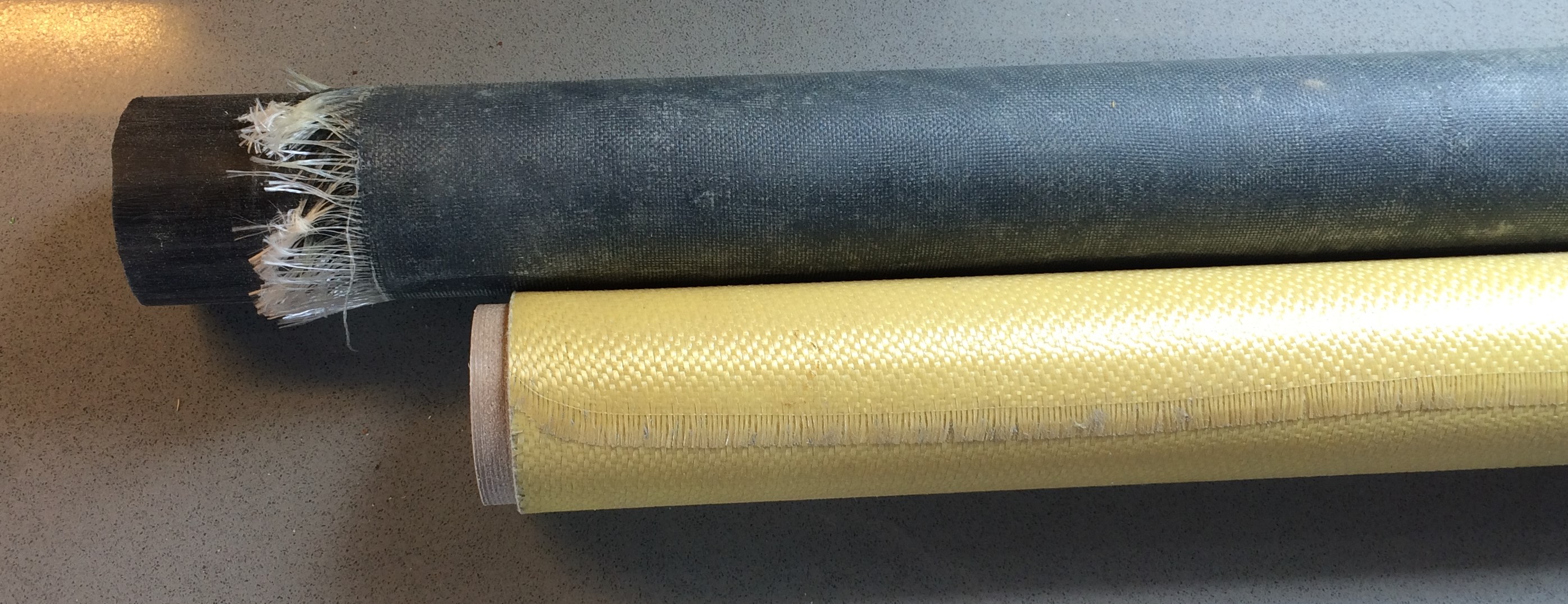 The largish Kevlar tube was my first try. It's on some very thin walled PVC (central vac tube maybe?) Note the finished edge didn't stay square but at least the fibers are all locked down. Also shown is ABS with fine glass before trimming. I can't even find the seam on that one.