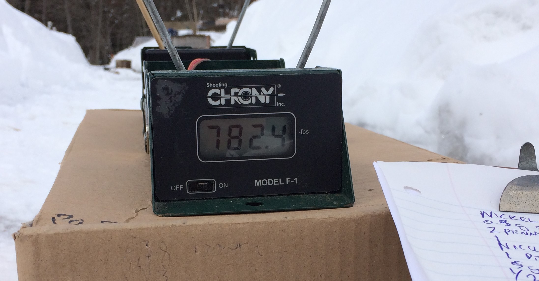 After much chronograph testing and many spurious readings (up to 897.5 fps) I revised my set-up and got:
