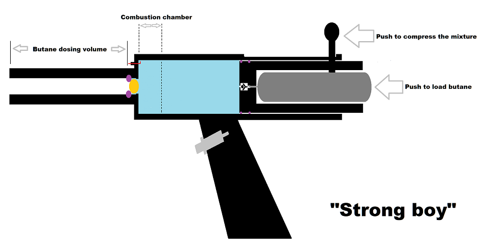 In another case, if I decrease the diameter of the piston to 1.8 cm, the area is 2.5 cm2. To obtain 80 cm3 of mixture, the useful length of the compression cylinder is 32cm. As double the length is necessary for the bolt system, the body of the weapon is 62 cm long and a 23 cm firing cannon. I have no problems with this appearance, I just have in mind that it is as comfortable as possible to zoom in.