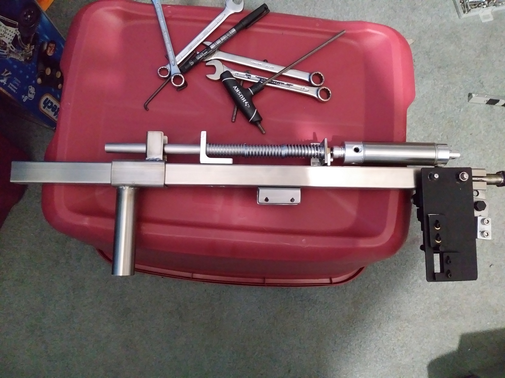 More done, linkage from charge handle to rear to be made and trigger needs a return spring, power seems low but that's what I wanted. The springs are about as much as I can push, rearward charging is definitely needed for more spring tension.