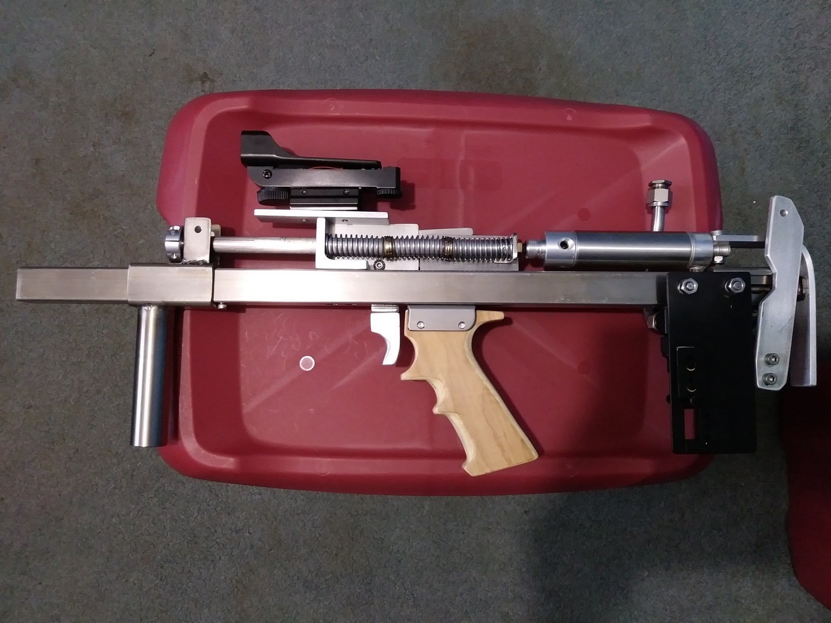 A bit of progress, bracket in the middle is for the grip, sprig guide needs a locking collar for the charge handle to push on, trigger not figured out yet or linkage to rear to load.