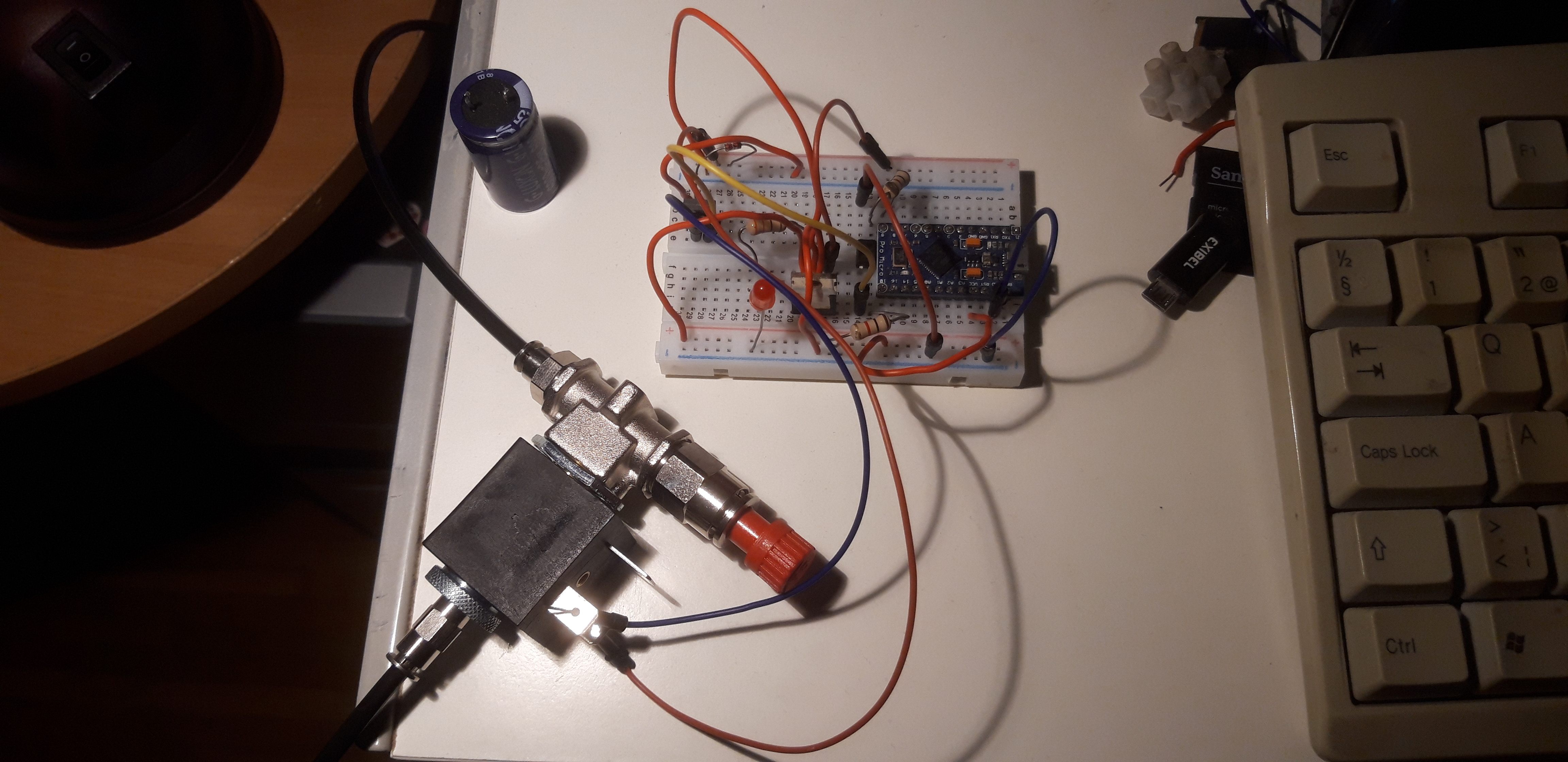 - A tiny Arduino clone (Pro Micro form SparkFun) controls power to the valve, in order to create the desired number and length of pulses.