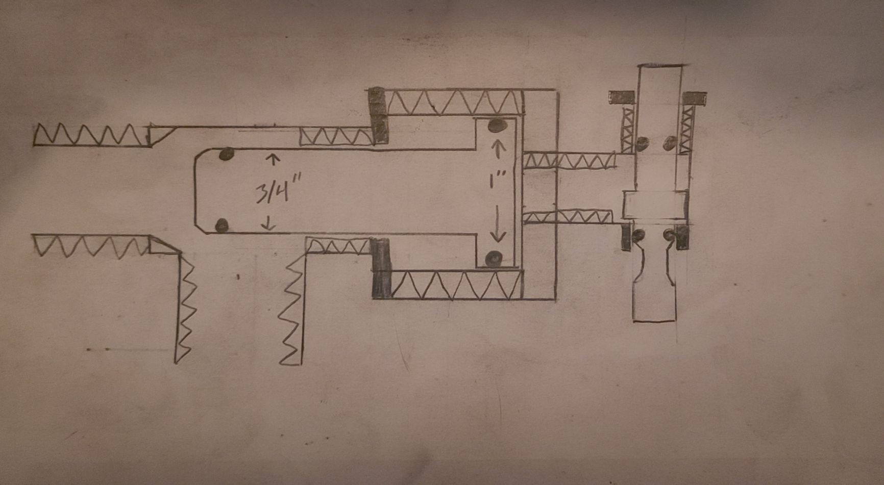 The "t" fitting that I use is a "street t" so it has one set of male pipe thread. The front of the piston sits inside the male threaded portion of the fitting. The back of the t has a 3/4-1" male to male reducer. The back of the piston sits in the 1" portion of the reducer. With out the reducer the piston would be balanced and would not fire on pressure differential.