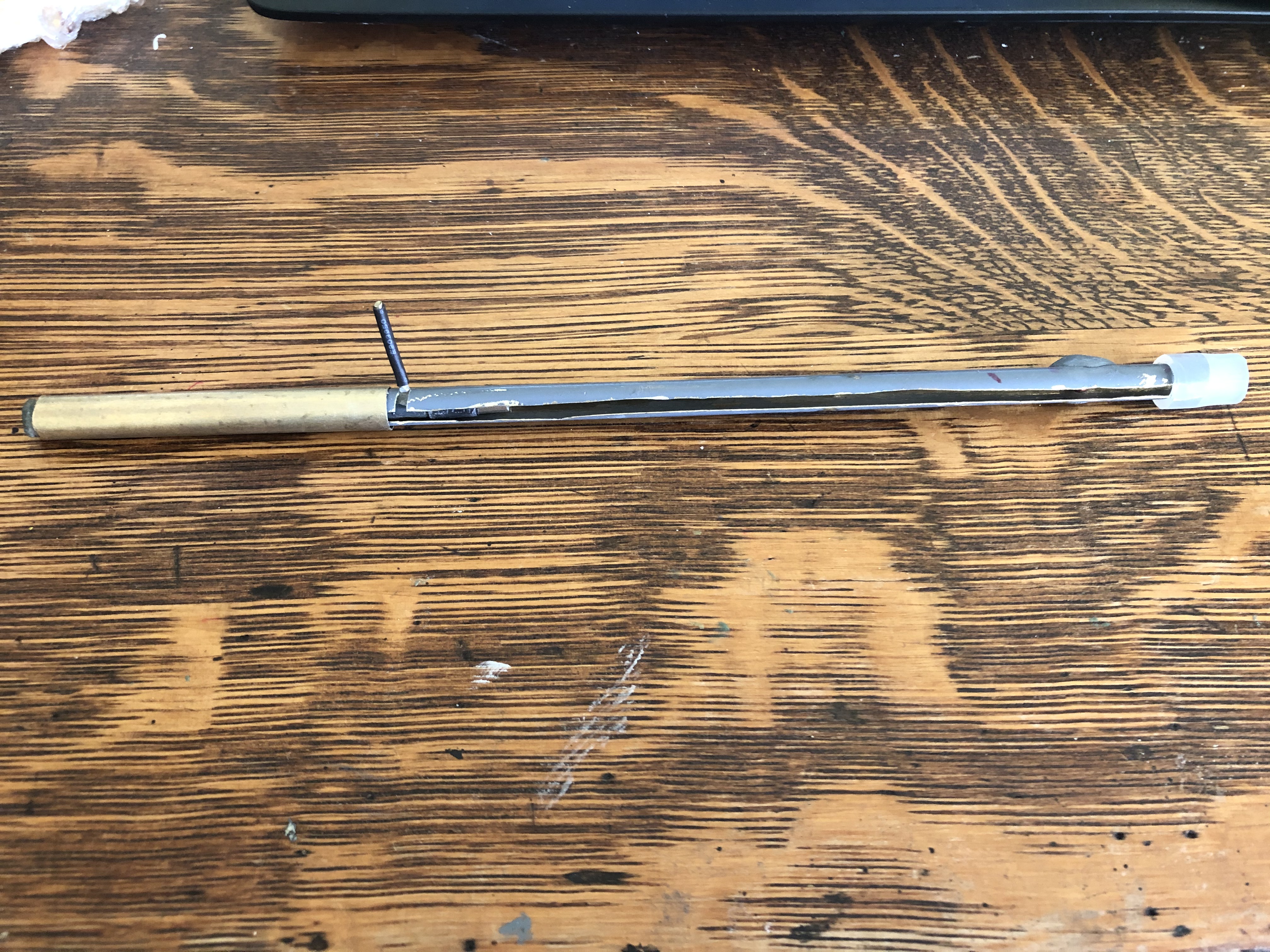 This is a crude magazine I've cobbled together with some brass pipe, compression springs, epoxy and heat shrink tubing. The capacity is about 50 .177 bbs. There's a large "L" shaped groove I cut to allow the follower to push bbs into the barrel.