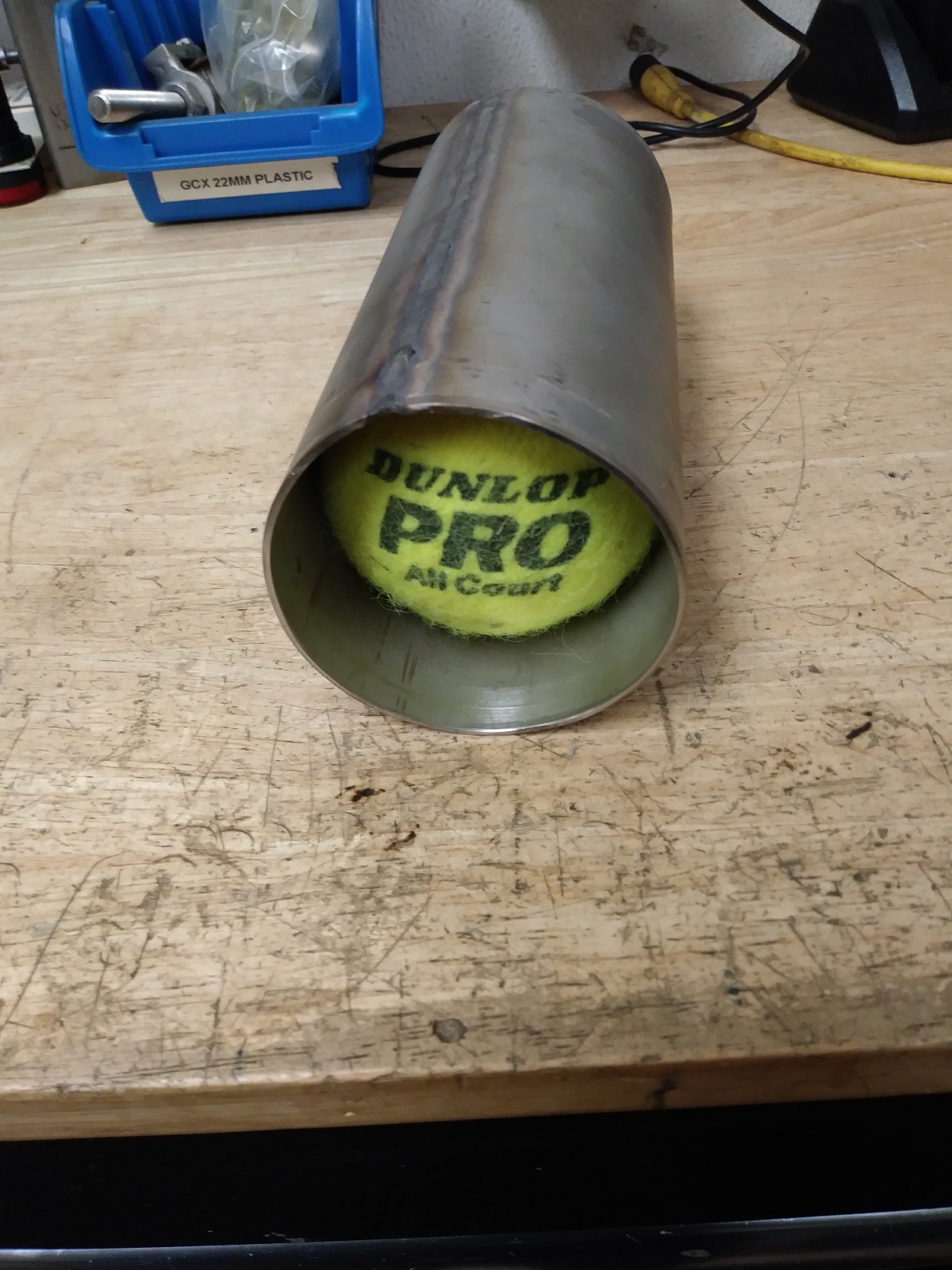 Atempting to make a low powered tennis ball launcher, couldn't find a suitable piece of pipe for the barrel so made my own from flat piece of stainless, not perfectly round and has a bit of a seam but I think it will do the job.
