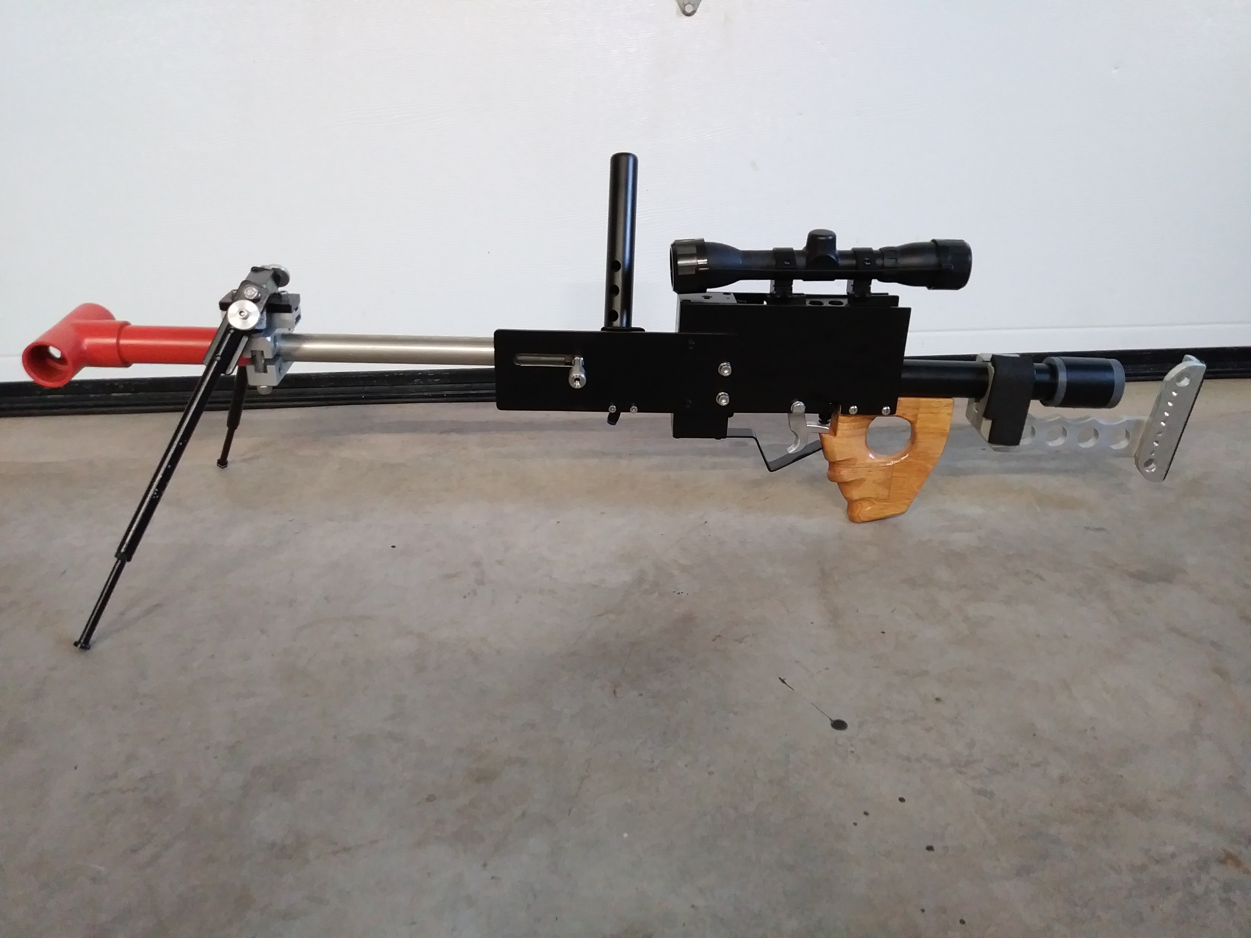 Running at upto 600fps @150psi, stainless steel barrel and chamber, 1/2" pilot air valve triggered by miniature 3/2 button valve, all hand made except the scope, PVC pipe for muzzle break. 7 shot gravity fed magazine tube, single shot bolt action.