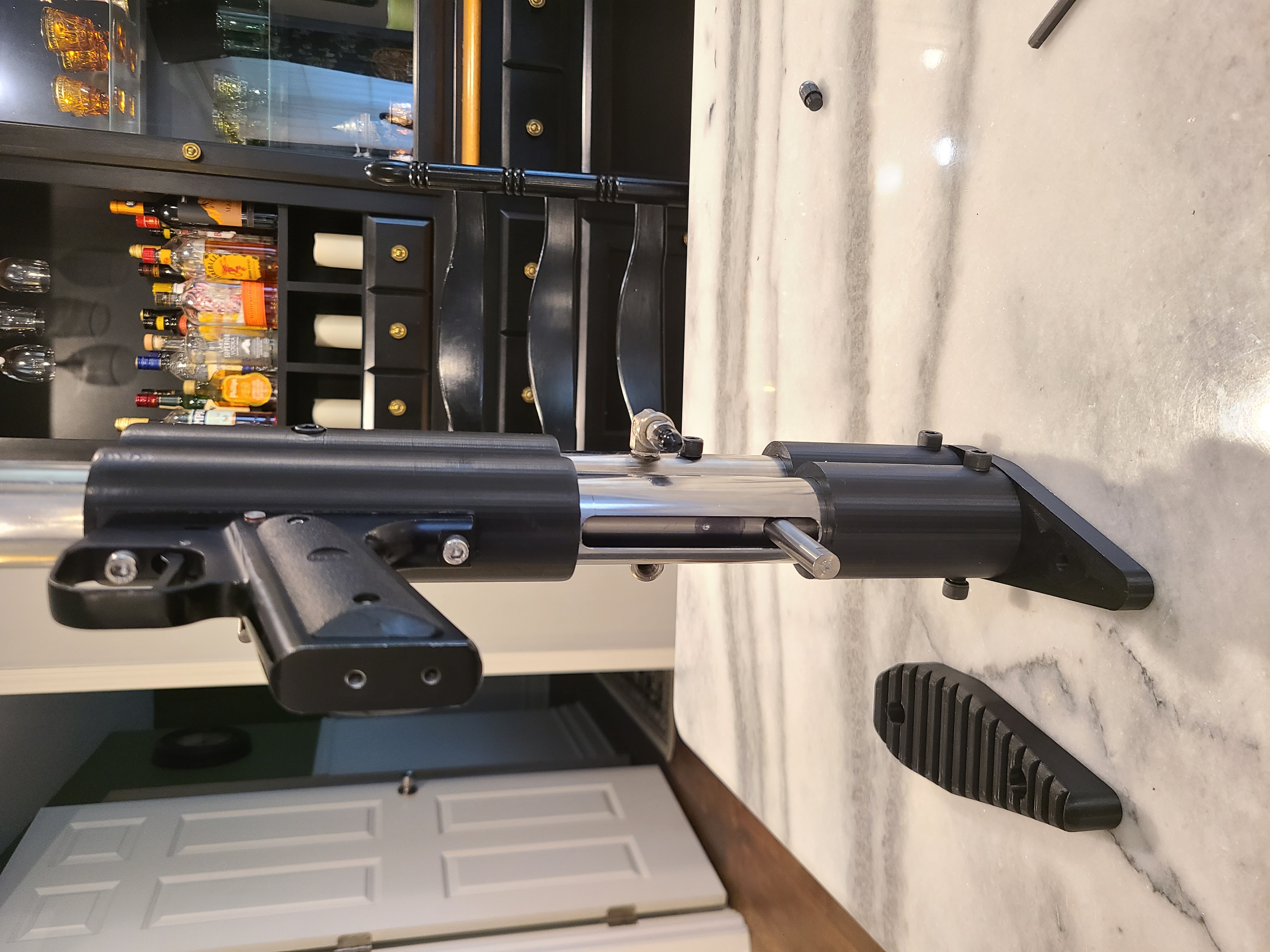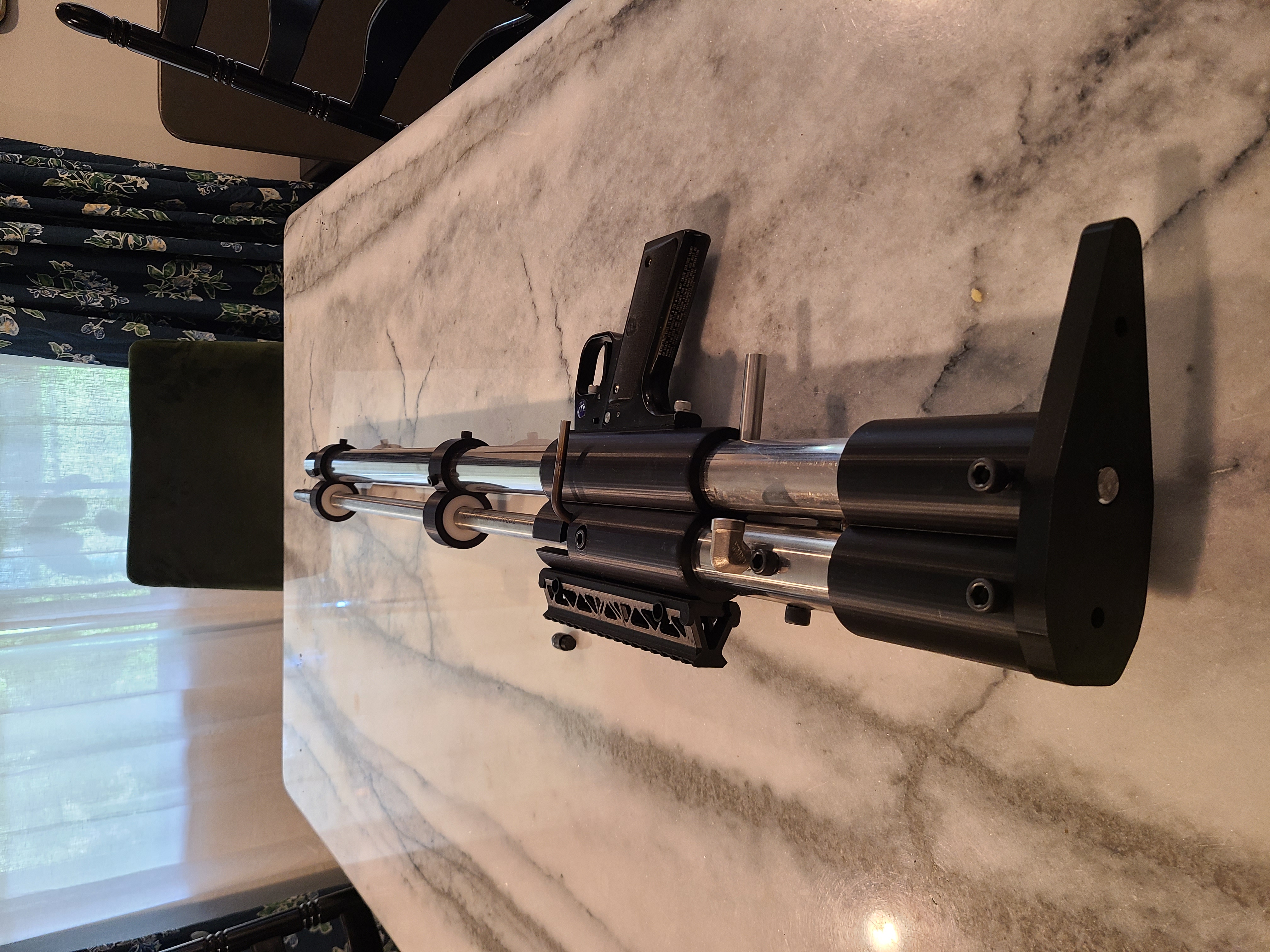 Here is the gun as it currently sits. All black portions (aside from handle) are 3d printed with Pla Tough. The handle is from an old paintball gun I had, with the sear extended to reach my hammer and re-hardened. The barrel bushings are turned out of Delrin.