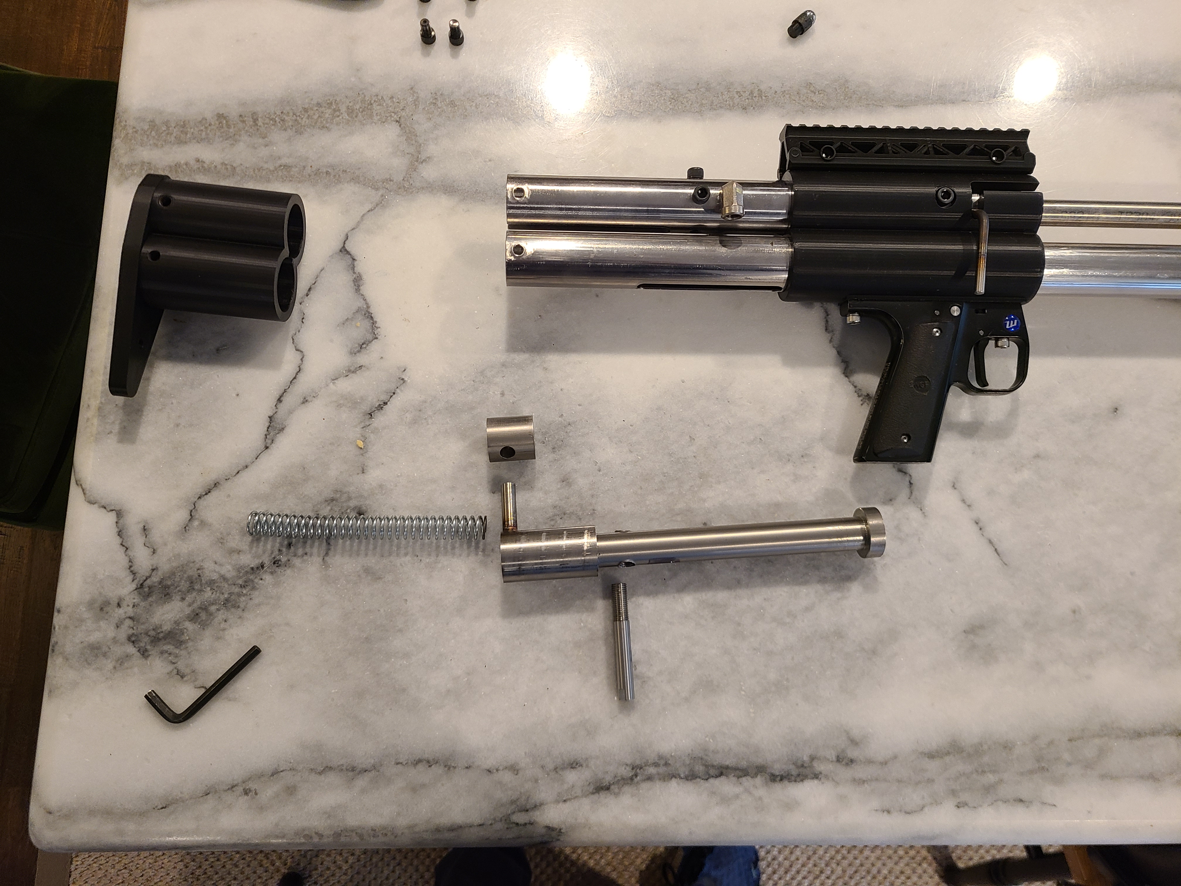 As for the suppressor, I have a few 3d models I'm playing with. Unfortunately the barrel needs to turn before it pulls away from its locked position, so I'm not able to think of a solid way to utilize the lower tube for expansion.