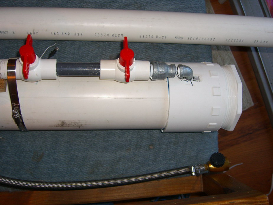 This is the newly built Potato Eliminator. I haven’t tested it yet. The chamber is an 18 inch long piece of 4 inch shc 40 PVC. On one end I glued a 4 inch female adapter and on the other a 4 inch coupling. In the coupling I glued a 4 inch spigot by 2 inch female thread bushing.
