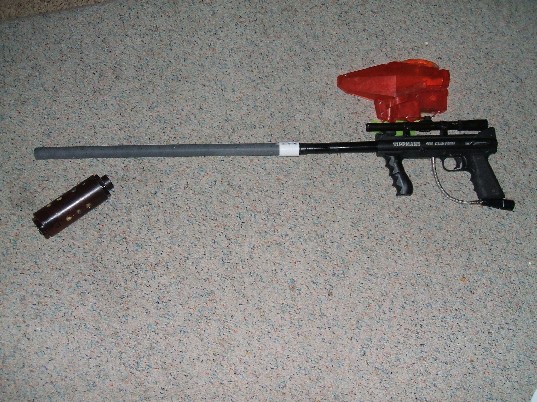 About two weeks ago, I had nothing to do so I modified my paintball gun (again :lol: ). I modified the barrel because some of you might know, a Tippmann 98 Custom comes with only an 8.5" barrel when you buy it. I found out that with a few layers of electrical tape, a 3/4" coupler fits perfectly over the end of the barrel. So I got a 2 foot piece of 3/4" Sch 80, chamfered one end, and stuck it in. This thing shoots as fast as ever, never breaks paint, and has more than twice the range of the original barrel, made for about 3 bucks. I know 3/4" Sch 80 isn't as good of a fit as SDR-13.5, but I tried an SDR-13.5 barrel and do to old and swollen paintballs, none made it out of the barrel intact. I recommend this mod to anyone who is tired of having to aim your paintball gun at a 30 or 40 degree angle to try to hit enemies at long range. And the suppressor from my sniper rifle fits (too bad the gun only makes noise at the bolt anyway :lol: ) Oh well, it still looks cool, or will if I ever paint the new barrel black and red. Anyway, here's the pics.