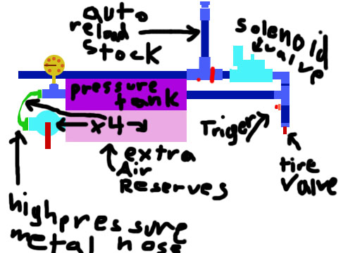 These are the plans to a gun that is fully automatic (or semi-auto if you dont hold the trigger down) and you can get about 55 shots without repressureizing the chamber. I'll be making it in a week and will put up some real pics then. But here are some rough plans.