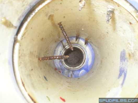 The next day, get your igniter, screws, 3/4" couplings, handle and wire ready. You will first want to screw the drywall screws into the chamber. These are your ignition contacts. To prevent the barrel from cracking (which shouldnt be a proplem if you have good pipe, but still do this), drill a hole a where you want the screws to go. You want about a 1/4" to 1/2" distance between the screw tips on the inside. You could put them on comlplete opposite sides of the chamber, but I put them closer together. - BARRELKNIFE.jpg (10.55 KiB) Viewed 8217 times