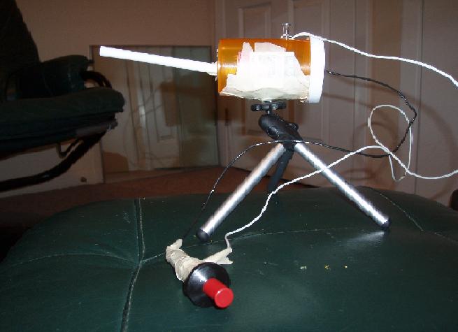 I have at least half a dozen mini's, but this one is probably the coolest. I used the tripod from a digital camera, a BBQ sparker, a pen, and a really big pill bottle. It uses hair spray and fires a Q-tip about 30 feet, but its snowing outside, so I just shot my door. The recoil knocks it over about half the time. My camera's mic won't pick up really sharp, loud noises, but this mini is about as loud, and kicks as much, as a .22 rifle.
