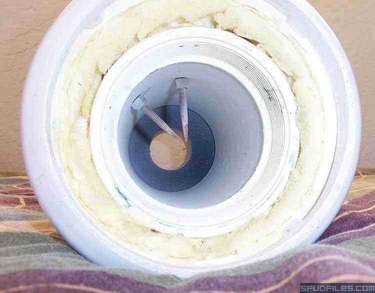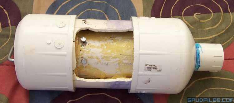 This is my first cannon. It's a 4x12" Sch40-PW PVC chamber, 4x2" ABS reducer, short section of 2" Sch40-PW PVC, 2" Sch40-42 female threaded adapter, a 4" Sch40-PW female adapter and a 4" Sch40-PW (yes, pressure rated) clean out plug. Of course I can't forget the shell made of 6" Sch40-PW pipe and end caps. After I had glued together the initial chamber I found out from Spudtech forum members that even thought I used transition glue the reducer has a high probability of separating from the chamber. So I built the shell. I machined the end plugs to have nice holes in them and proceeded to glue the shell together with the chamber. I then filled it with expanding foam in hopes of containing chamber failure. I later had to cut the huge gaping hole you see because of a design fault. 2 disposable cameras through an ignition coil had sufficient voltage to jump through wire insulation and 1" of foam, but I suspect a bubble formed around the wires leaving only some kind of gas between them. So I cut out the hole with the intent of building an ignition system into it and placing a piece of Lexan over the hole. Before this happened I decided I wanted multiple sparks, a stun gun and propane ignition, so I proceeded to build STAG2.