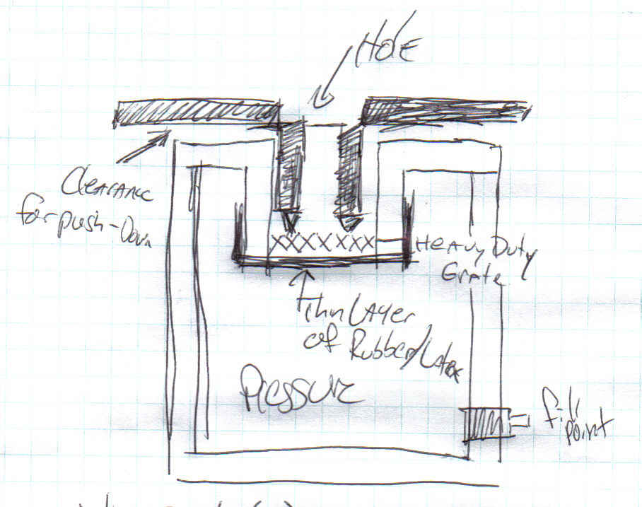 The XXXX Layer is a heavy grate at the bottom of the chamber. The rubber or latex or whatever you find works best for the diaphragm will just be wrapped over the end and sealed. This setup will allow the "burst disc" style diaphragm only to rutpture when stepped on, as it would be penetrated by the punch pins on the sliding top plate. The load of flour or paint would go in the center hole. Obviously this is just a rough sketch, but it should help to illustrate my idea...