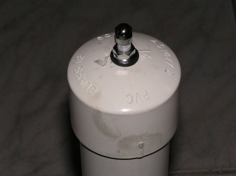 I think what Benstern said about the threaded shrader valve is and would be the best thing to use. I know some say it's not hard to put the pop-in valve in and that it is easy to put in with some elbow grease so to speak but for safty sake I would use the treaded schrader valve. It's not hard to put it in and its not as flimsy as a pop-in valve. Just drill a hole tap the hole to except the treads from the schrader valve, teflon the treads and put it in. I'm sure you won't regret it, just be sure to put it were two pieces of pvc join (IE a glue point in the back) sorry for this being so long, but I don't want people to be hurt Benstern Is completly right!