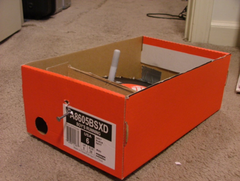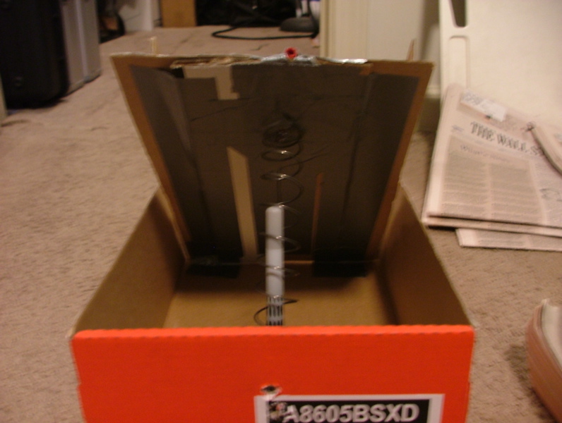 well i could have a hinge made of tape attaching the board thingy to the shoebox on 1 end and have the spings with a pin on the other side
