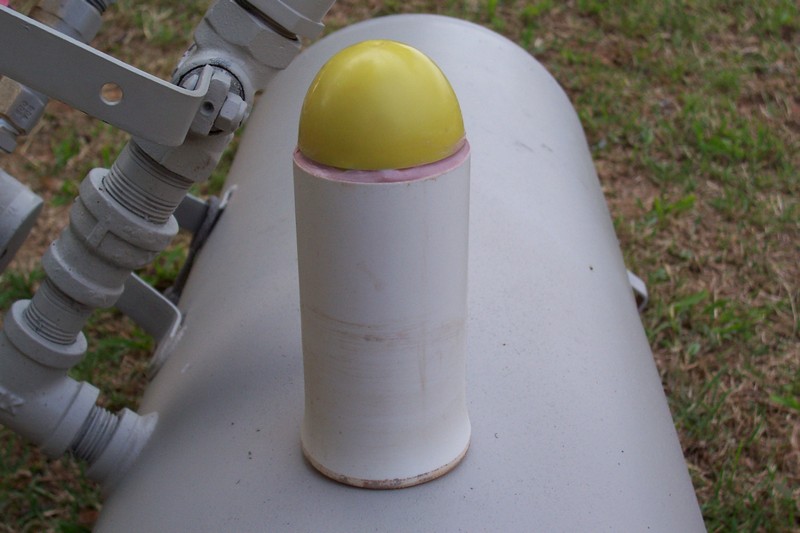 Here is a pic of my 1 1/2" diameter shell for my 2 inch mortar. I didnt have a cap at the time so i just used bondo to plug it up, bondo is great stuff! I flared out the bottom of the shell in a tin can of cooking oil and pushed it down on a funnel, was not hard at all. Im gonna make a few more since i have a 10' piece of pvc now. I was shocked at how far this thing shot.