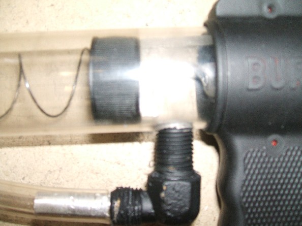 My newest airsoft strafer, thrown together for the competition. It utilizes a clear 1" SDR 21 chamber, a spring powered plunger, ghetto cut (but very clean) threads in the back, a 2 foot 9/32" brakeline barrel, a fake silencer that looks really kickass, a modified blowgun in a PVC handle, some clear epoxy, a clear vortex block with no shrouds and the front filed away for better feed, and some other stuff. It's about as strong as the Pocket Strafer but has a higher ROF and lasts longer (compared to the 1 second of firing out of the Pocket Strafer