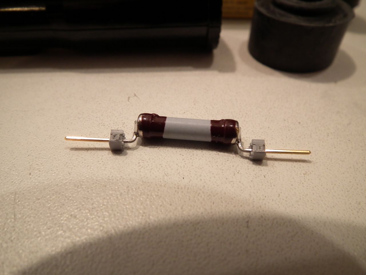 - Use a resistor in the HV path to limit the current in the spark. This requires a high voltage resistor, and those are not easy to find and pretty expensive at the electronics stores. I knew regular spark plugs often comes with an internal resistor, exactly to reduce electric noise, and by researching this a bit, I found that you can get spark plug caps with built-in resistors. My plan was then to break open a spark plug cap and hopefully be able to salvage the resistor. So I bought 2 different types of resistor caps at the engine store, and what do you know, one of them could be disassembled using only a screwdriver and out comes the perfect little high voltage 5kΩ resistor, even with solderable tabs at each end! It did set me back around $8 US, and I'll need 1 resistor for each cannon. I'll have to see if ebay can help with cheaper resistor spark plug caps. The spark plug cap is a NGK XD05F, stock no. 8072.