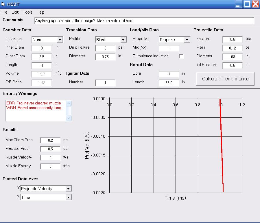 I'm aware of the issues regarding early movement and how not modeling combustion in the barrel will affect velocity. I believe I mentioned low velocities in the original post in the thread... I didn't mean 5% low. I meant LOW.5. Let me be the first to take your model and do something with it that it wasn’t designed for. If I try to model a 1X gun without a burst disk, and using the burst disk pressure as the static friction, and assuming the friction input is the dynamic friction, and comparing to my standard gun (3"x11" chamber, single central spark, 2"x30" barrel, 80g spud, chrono muzzle velocity ~330FPS) the model gives a muzzle velocity of ~140FPS. That's off by a factor of more than 2. I suspect this is caused by the model not doing combustion in the barrel. Actually, I suspect the problem is a bit more general in that it isn't correctly modeling combustion in the chamber or the barrel after the spud has started to move. In a 1X no-burst-disk gun the projectile starts to move very early in the combustion process, probably after only 10~20% of the fuel has been burned.