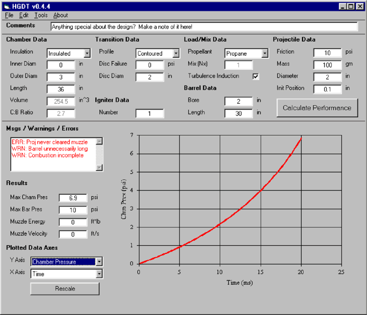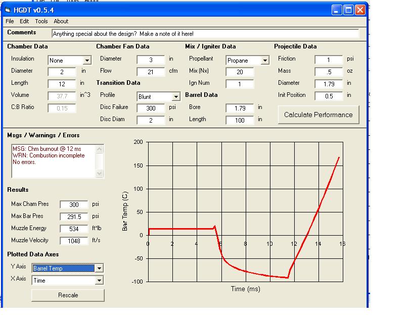 Regarding the "cold barrel": You set your burst diaphram to go almost the moment combustion started. In essence, your gun was running as a straight up pneumatic. The only reason why the chamber burned out so quickly is because most of the unburned fuel/air had already left the chamber and was in the barrel. The rise of the barrel temp towards the end was when the gases in the barrel started to burn.Lentamentalisk wrote:I just DLed the latest version of HGDT today, and several oddities occurred