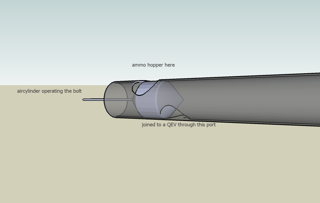 the barrel will have two ports cut in it: one for ammo and one for the main valve... when compared with the previous design ammo port will be closer to the shooter/behind the T and the bolt will push it past the 'QEV' port... and... that's it