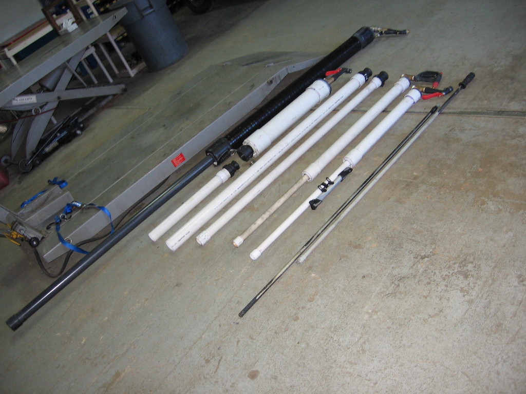 - from the left, my GB gun, my modular toolie valve gun and short 2" barrel, the 2.5" tennis ball barrel, the 1.5" barrel, my personal coax 1" barrel 2" chamber, coax I made for a coworker ( check out his bike pump accesory, 40 pumps=55psi, he uses it indoor with a target trap and superbounce balls), and my 2-piece conduit and coupler ramrod....