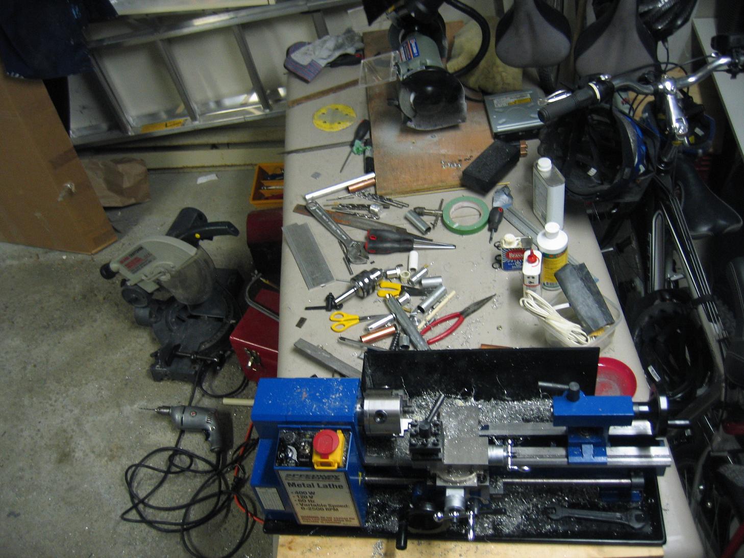 Note the bunch of tools lying on the ground and on the table ( actually, only half of the tools are shown, all my grandp'as and the dremel + toolboxes are under the table ...)