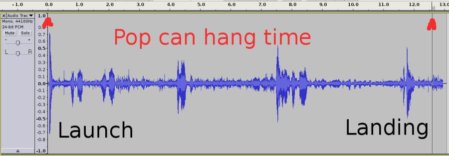 Edit: I took the time to do the Audacity time of the pop can launch. The sound from launch to impact is about 12.6 seconds. The time the impact sound returns will need to be subtracted from the total time. Removing that .3 seconds leaves a hangtime of 12.3 seconds with a full soda.