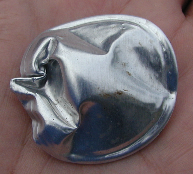 Bump, I found the bottom of the can after a search of the lawn. What I found blew me away. The bottom was standing on edge down in the grass which is why it was hard to spot. I picked it up and noticed the edges were very smooth, not sharp. I then noticed why, very evenly all the way around the edge is folded over. This recessed portion of the can flattened some on impact and made a Z fold in the bottom of the can and then tore loose leaving a nice folded over crimped edge.